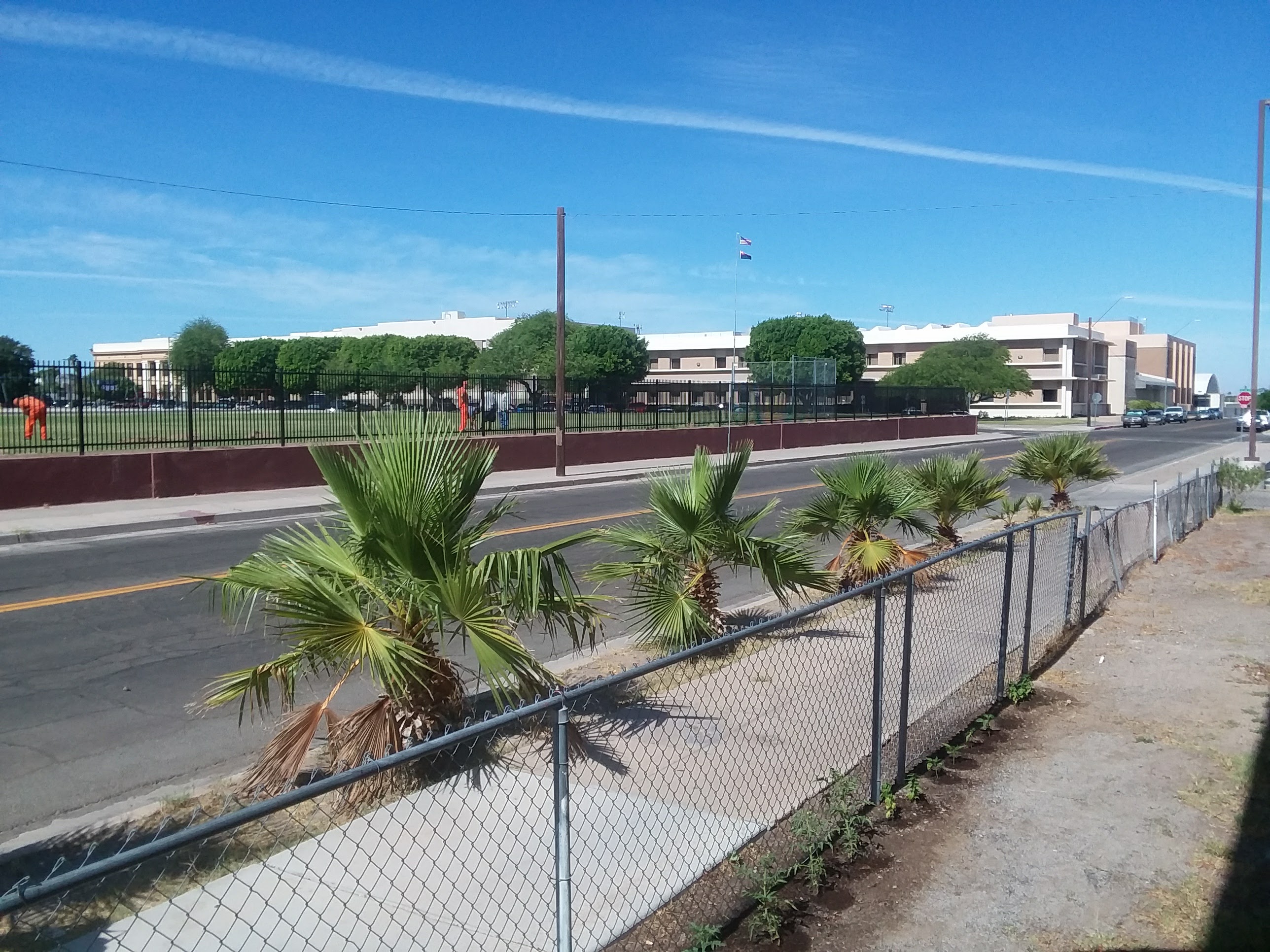 I took this photo on June 7, 2017. This location was my living place at 500 West 4th Street. See my little vegetable garden (tomatoes, peppers, and sweet basil) growing along the chain link link fence. The workers in orange suits working on the field. School is out. Behind them is the infamous Yuma High School. I lived very close to Yuma High School. I tried to work there but it never happened. I am happy that I did not work there. My time working in schools is well over. This is how close I was to this ridiculous setup admiring criminals. It is still happening here in Yuma, AZ as of this day, September 2, 2025. These people think it is OK to have a mascot like this. It is a crazy mindset.
