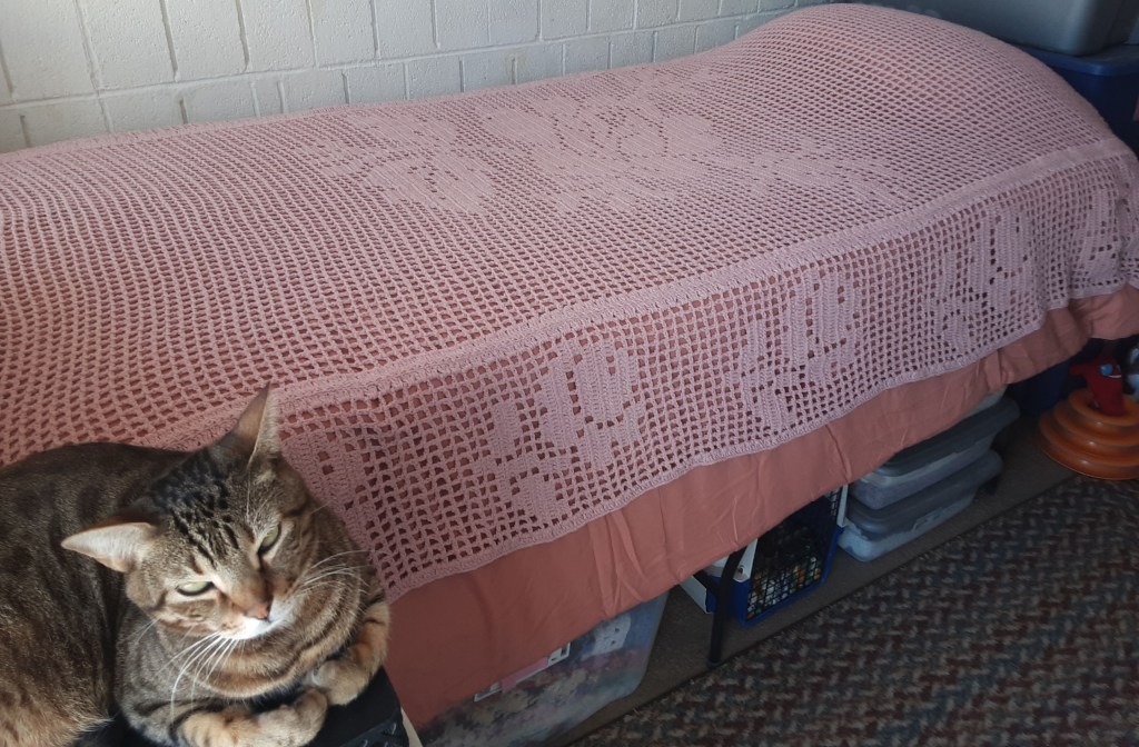 Today I had to focus on finishing a long term crochet project and I did finish it. It is called the Bed of Roses Filet Throw.